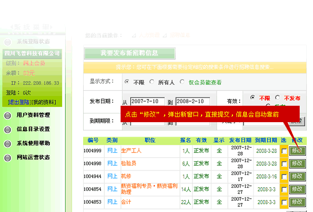 · 請問怎樣讓我發(fā)布的招聘信息一直顯示在招聘信息的第一頁? 2007年11月3日